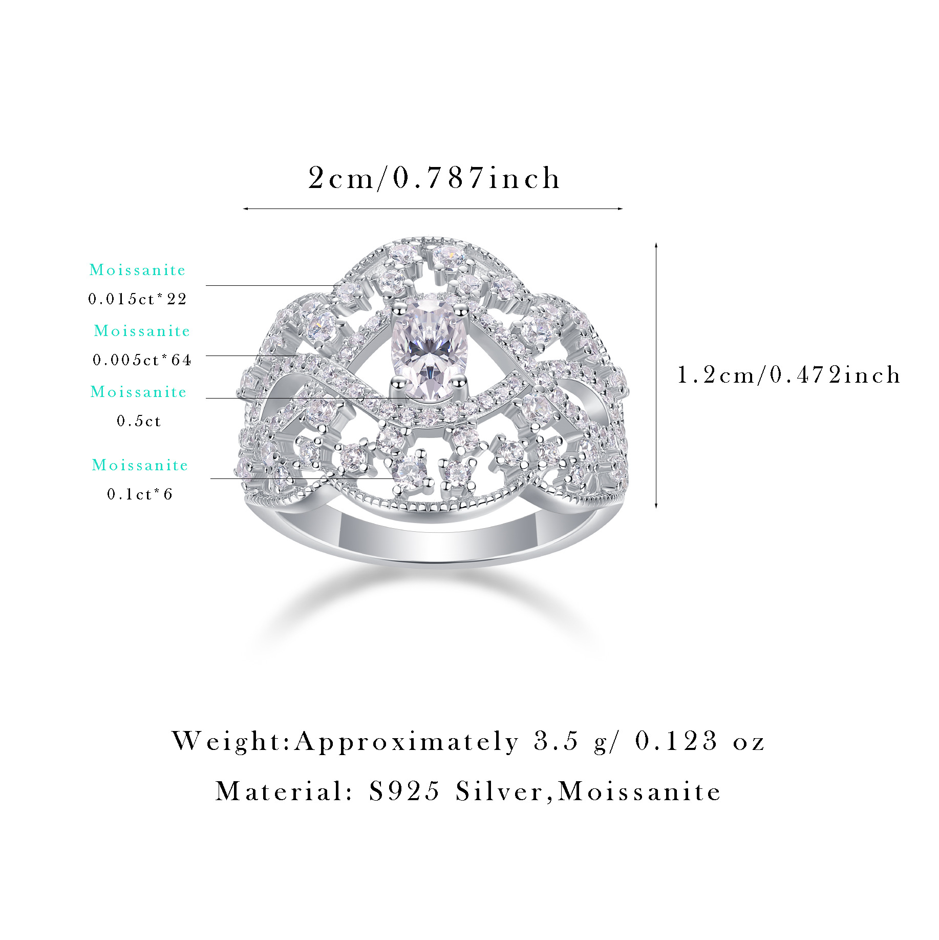 Material: 925 Silver + Moissanite diamond+Cubic zirconia
